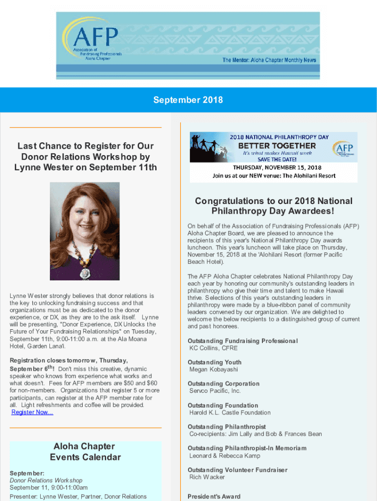 September 2018Last Chance to Register for Our Donor Relations Workshop by Lynne Wester on September 11thCongratulations to our 2018 National Philanthropy Day Awardees! On behalf of the Association