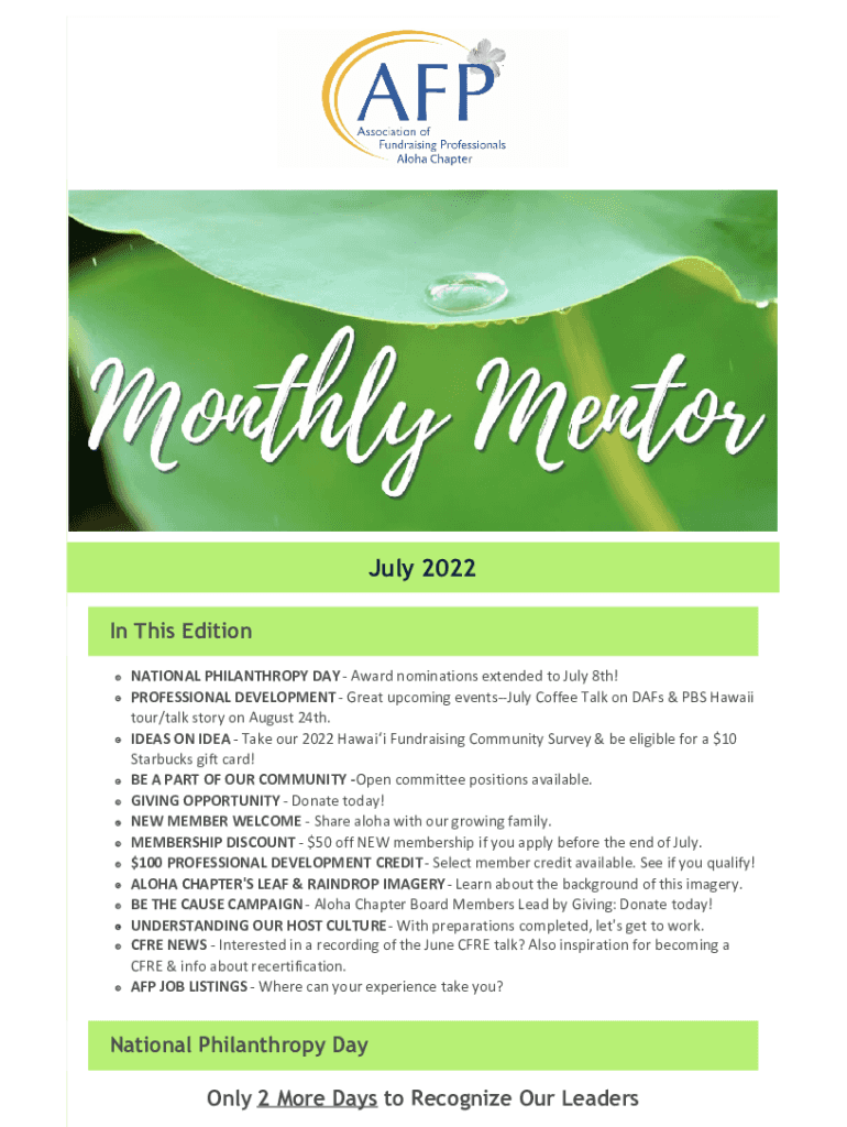 July 2022 In This Edition NATIONAL PHILANTHROPY DAY Award nominations extended to July 8th! PROFESSIONAL DEVELOPMENT Great upcoming events July Coffee Talk on Days & PBS Hawaii tour/talk story on
