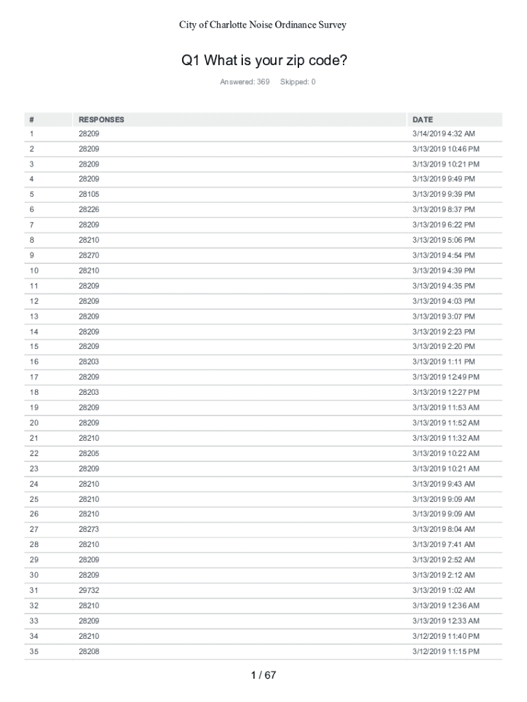 City of Charlotte Noise Ordinance SurveyQ1 What is your zip code? Answered: 369Skipped: 0#RESPONSESDATE1282093/14/2019 4:32 AM2282093/13/2019 10:46 PM3282093/13/2019 10:21 PM4282093/13/2019 9:49 PM5281053/13/2019