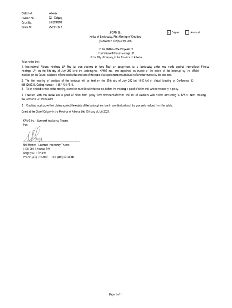 District of: Division No. Alberta 02 CalgaryCourt No.252731797Estate No.252731797 _FORM 68_ Notice of Bankruptcy, First Meeting of Creditors (Subsection 102(1) of the Act)XOriginalAmendedIn the Matter