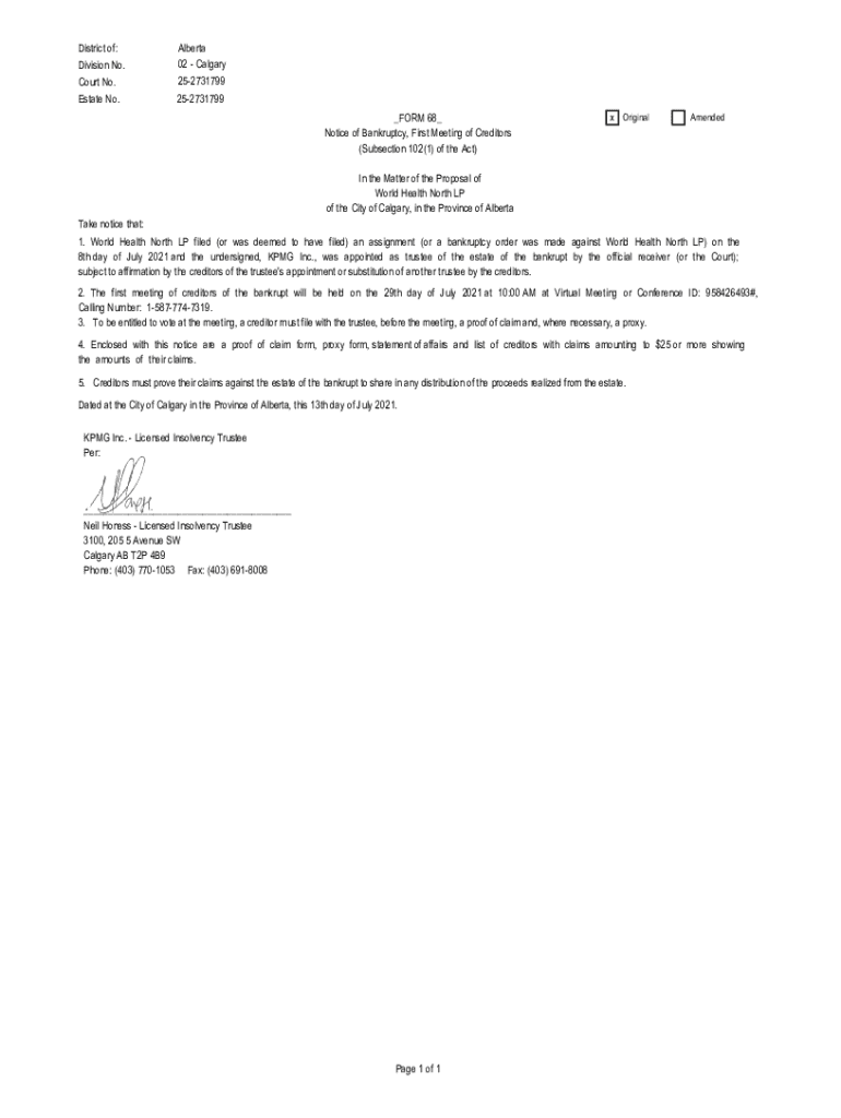 District of: Division No. Alberta 02 CalgaryCourt No.252731799Estate No.252731799 _FORM 68_ Notice of Bankruptcy, First Meeting of Creditors (Subsection 102(1) of the Act)XOriginalAmendedIn the Matter