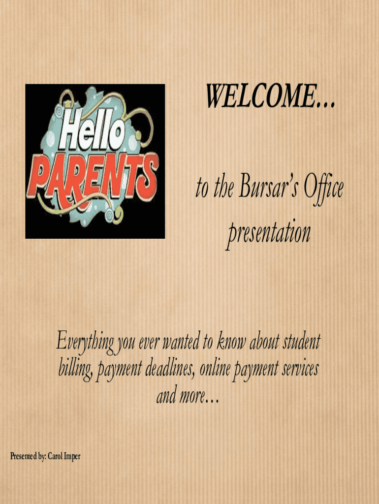 WELCOME to the Bursars Office presentation Everything you ever wanted to know about student billing, payment deadlines, online payment services and more Presented by: Carol ImperOverview Bursar Office