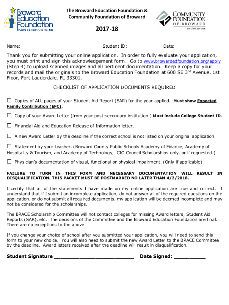 The Broward Education Foundation & Community Foundation of Broward201718 Name:___Student ID: ___Date:___Thank you for submitting your online application. In order to fully evaluate your application,