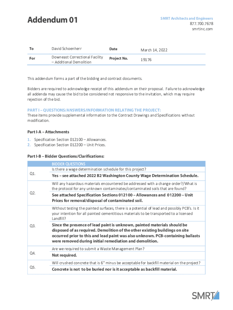 Addendum 01SMRT Architects and Engineers877.700.7678 sorting.comToDavid SchoenherrDateMarch 14, 2022ForDowneast Correctional Facility Additional DemolitionProject No.19176This addendum forms a part