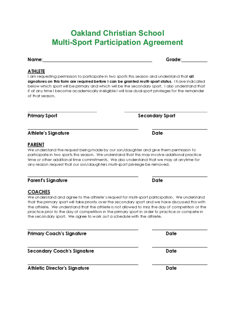 Oakland Christian School MultiSport Participation Agreement Name:Grade:ATHLETES am I requesting permission to participate in two sports this season and understand that all signatures on this form
