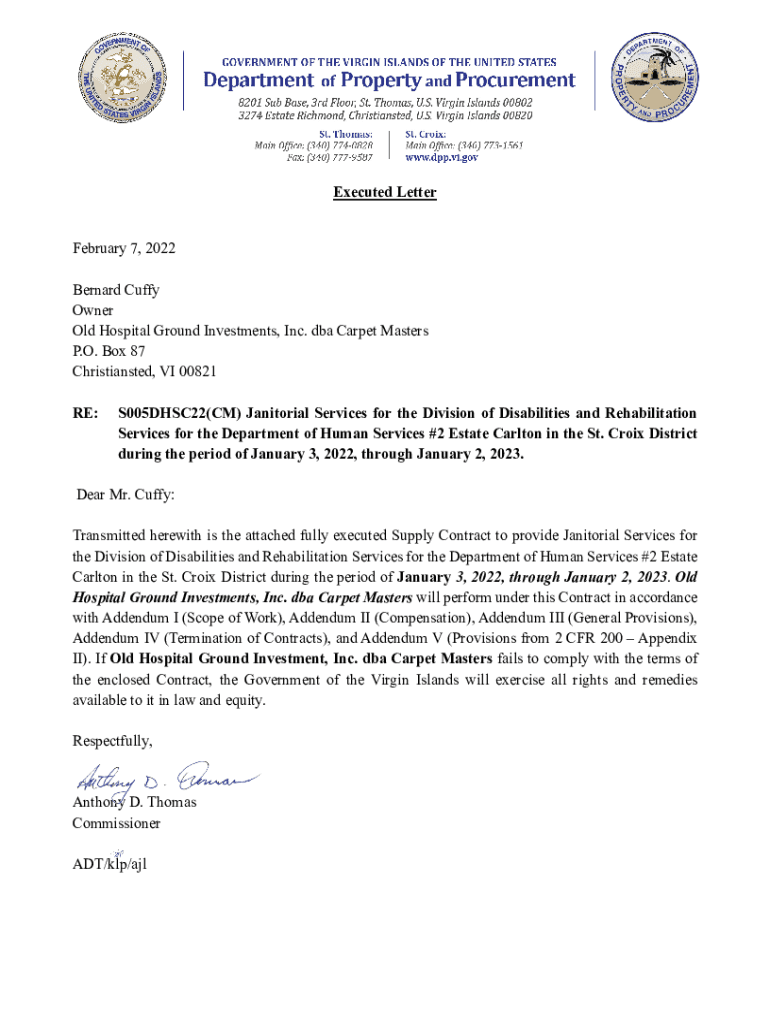 Executed Letter February 7, 2022, Bernard Buffy Owner Old Hospital Ground Investments, Inc. DBA Carpet Masters P.O. Box 87 Christiansted, VI 00821 RE:S005DHSC22(CM) Janitorial Services for the Division