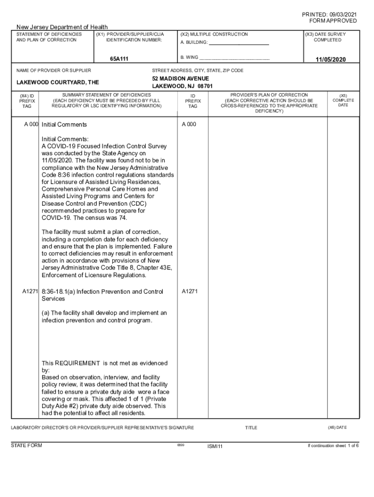 PRINTED: 09/03/2021 FORM Approved Jersey Department of Health STATEMENT OF DEFICIENCIES AND PLAN OF CORRECTION(X1) PROVIDER/SUPPLIER/CIA IDENTIFICATION NUMBER:(X2) MULTIPLE CONSTRUCTION A. BUILDING:
