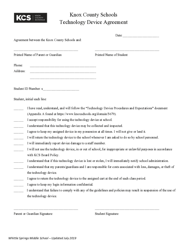 Knox County Schools Technology Device Agreement Date:___ Agreement between the Knox County Schools and: ______Printed Name of Parent or GuardianPrinted Name of StudentPhone:___Address:___ ___Student