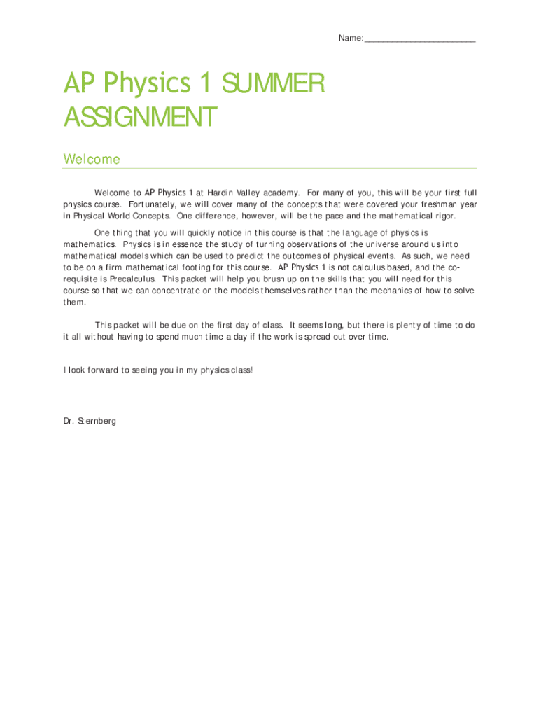 Name:___AP Physics 1 SUMMER ASSIGNMENT Welcome to AP Physics 1 at Hardin Valley academy. For many of you, this will be your first full physics course. Fortunately, we will cover many of the concepts