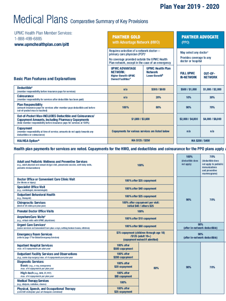 Plan Year 2019 2020Medical Plans Comparative Summary of Key Provisions UPMC Health Plan Member Services: 18884996885 www.upmchealthplan.com/pittPANTHER GODFATHER ADVOCATE with Advantage Network (HMO)(PPO)Requires