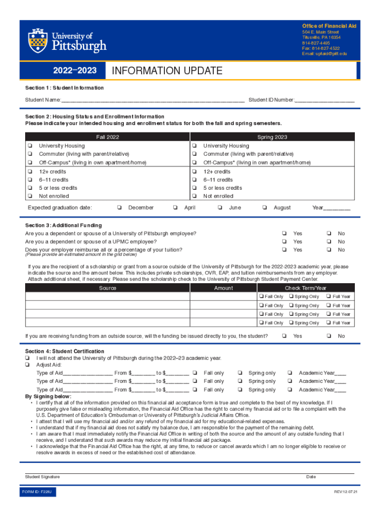 Office of Financial Aid 504 E. Main Street Titusville, PA 16354 8148274495 Fax: 8148274522 Email: uptaid@pitt.edu20222023INFORMATION UPDATESection 1: Student Information Student Name:___Student ID