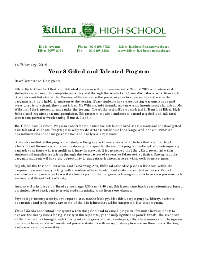 Koala Avenue Killer NSW 2071Phone 02 9498 3722 Fax 02 9498 2202killarah.school@det.nsw.edu.au www.killarah.schools.nsw.edu.au14 February, 2019Year 8 Gifted and Talented Program Dear Parents and Caregivers,