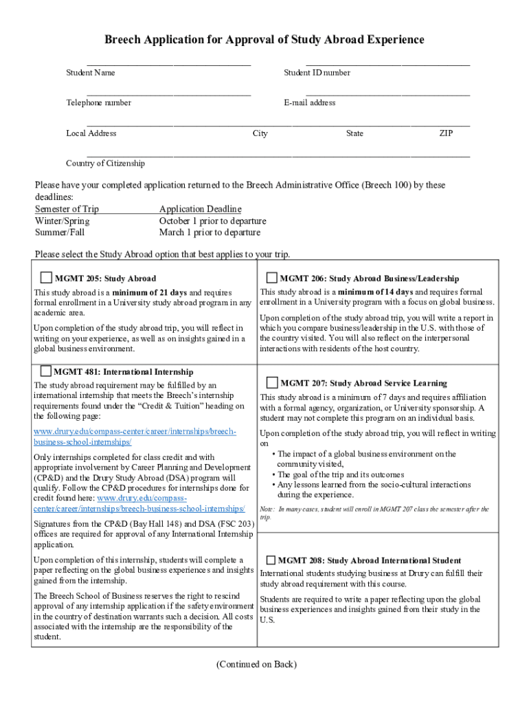 Breech Application for Approval of Study Abroad Experience ______Student NameStudent ID number______Telephone numberEmail address___Local AddressCityStateZIP___Country of CitizenshipPlease have your