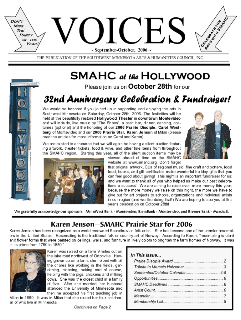 VOICES September October 2006 C Ar eye t s BR w ate with t SM he AH Cont Miss The Party of the Year!THE PUBLICATION OF THE SOUTHWEST MINNESOTA ARTS & HUMANITIES COUNCIL, INC.SMAC at the Hollywood