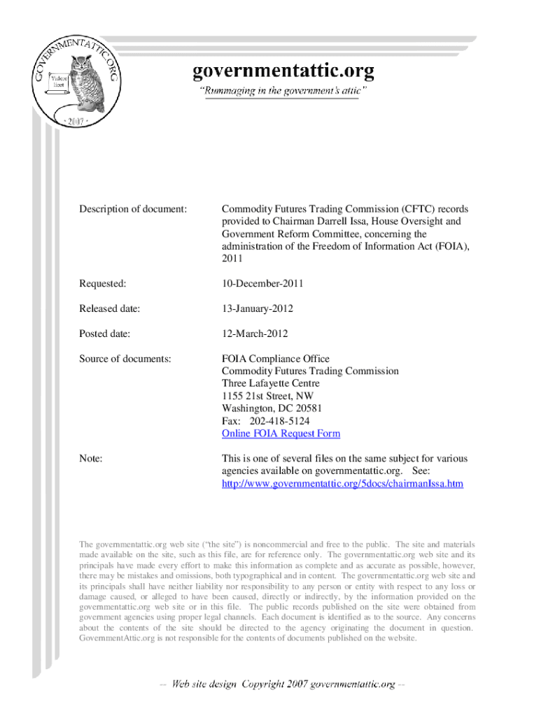 Commodity Futures Trading Commission (CFTC) records provided to Chairman Darrell Issa, House Oversight and Government Reform Committee, concerning the administration of the Freedom of Information