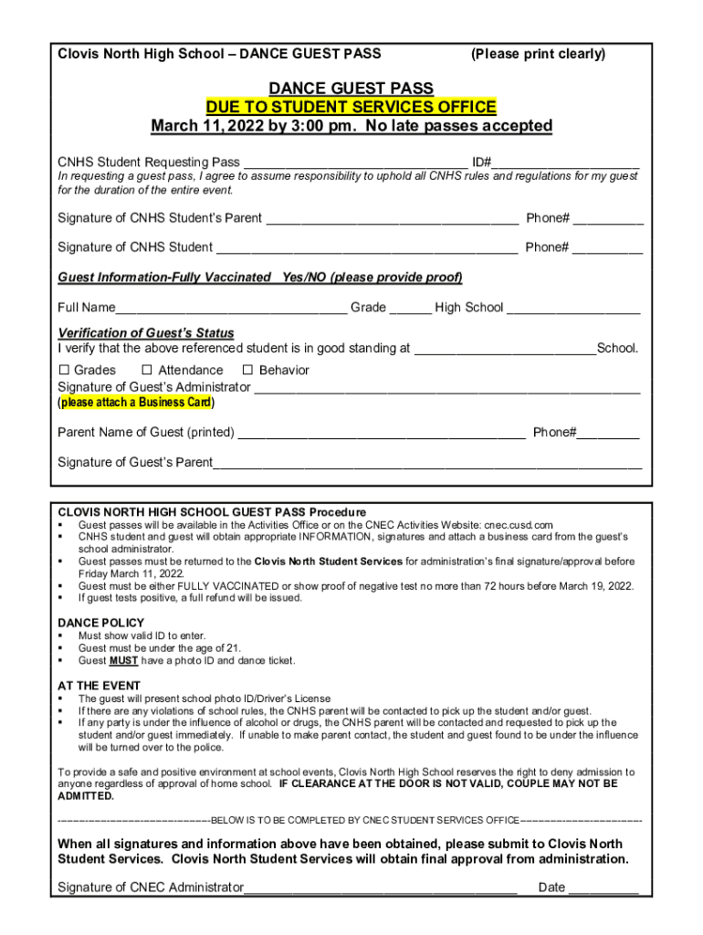 Clovis North High School DANCE GUEST PASS(Please print clearly)DANCE GUEST PASS DUE TO STUDENT SERVICES OFFICE March 11, 2022, by 3:00 pm. No late passes accepted NHS Student Requesting Pass ___ ID#___