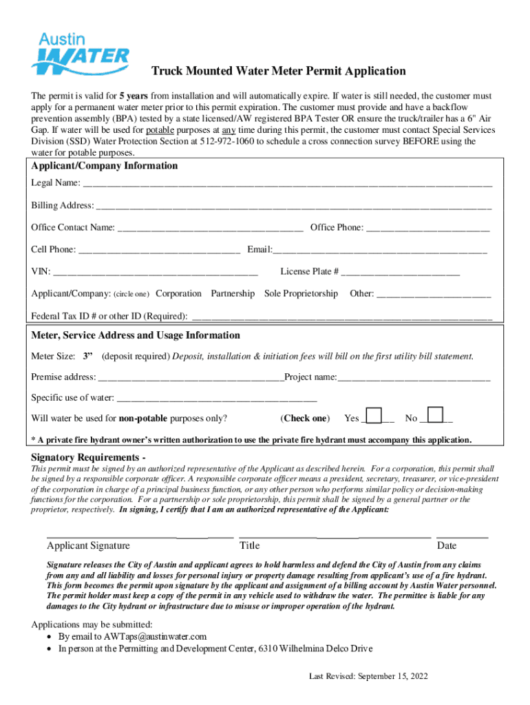 Truck Mounted Water Meter Permit Application The permit is valid for 5 years from installation and will automatically expire. If water is still needed, the customer must apply for a permanent water