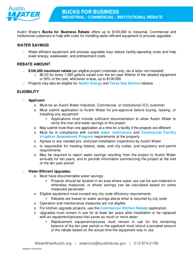 BUCKS FOR BUSINESS INDUSTRIAL / COMMERCIAL / INSTITUTIONAL REBATE Austin Waters Bucks for Business Rebate offers up to $100,000 to Industrial, Commercial and Institutional customers to help with costs