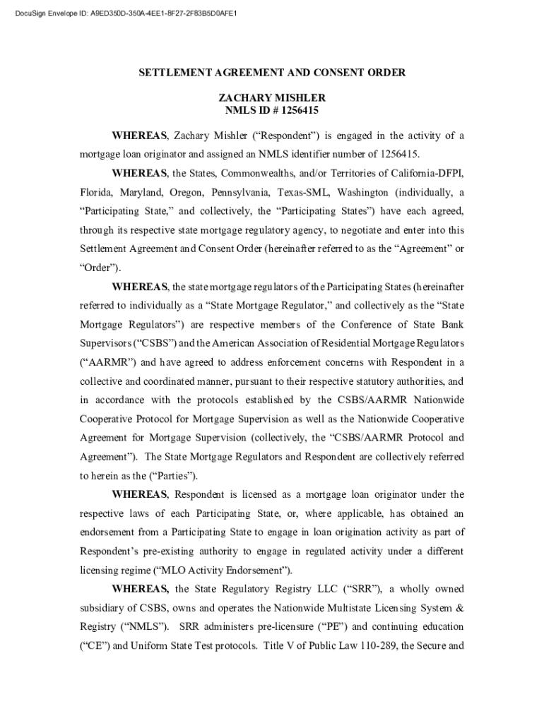 Get the free settlement agreement and consent order zachary mishler nmls ...