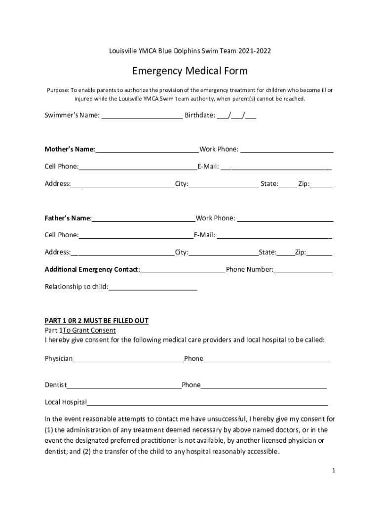 Louisville YMCA Blue Dolphins Swim Team 20212022Emergency Medical Form Purpose: To enable parents to authorize the provision of the emergency treatment for children who become ill or injured while