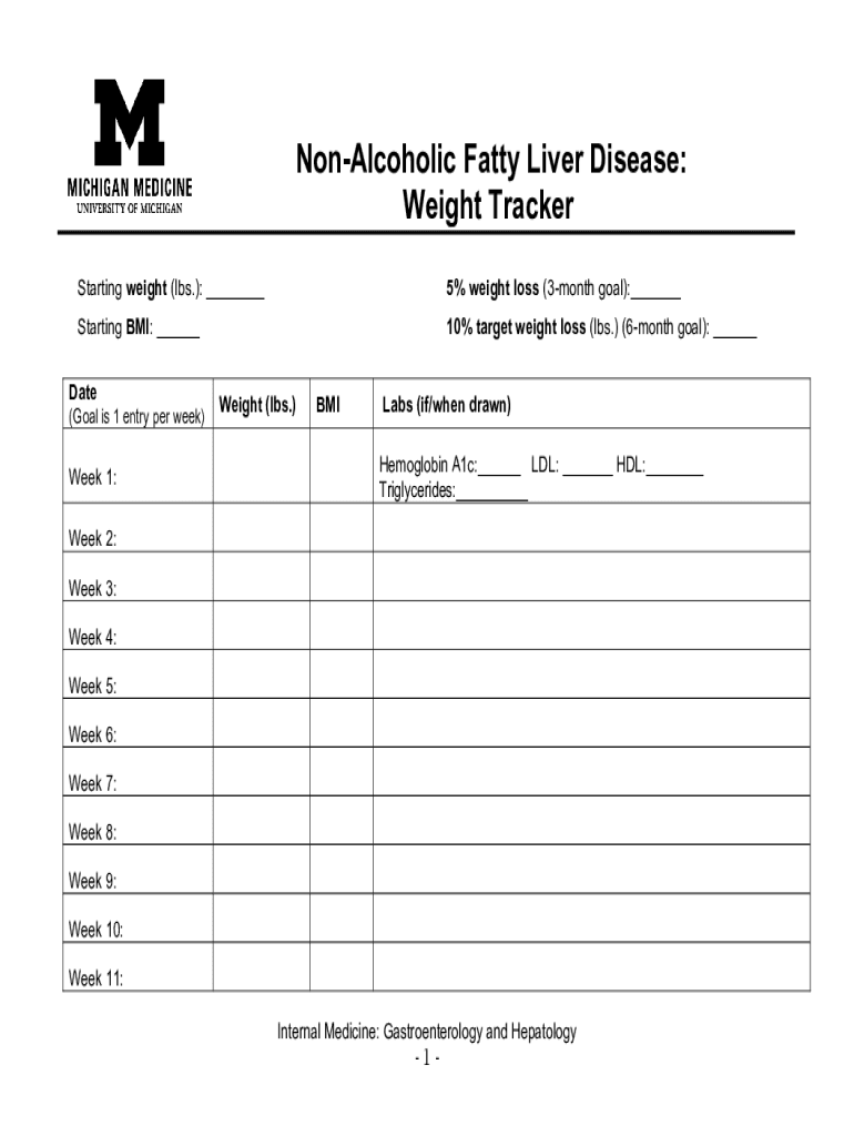 Nonalcoholic Fatty Liver Disease: Weight Tracker Starting weight (lbs.): ___5% weight loss (3month goal):___Starting BMI: ___10% target weight loss (lbs.) (6month goal): ___Date(Goal is 1 entry per