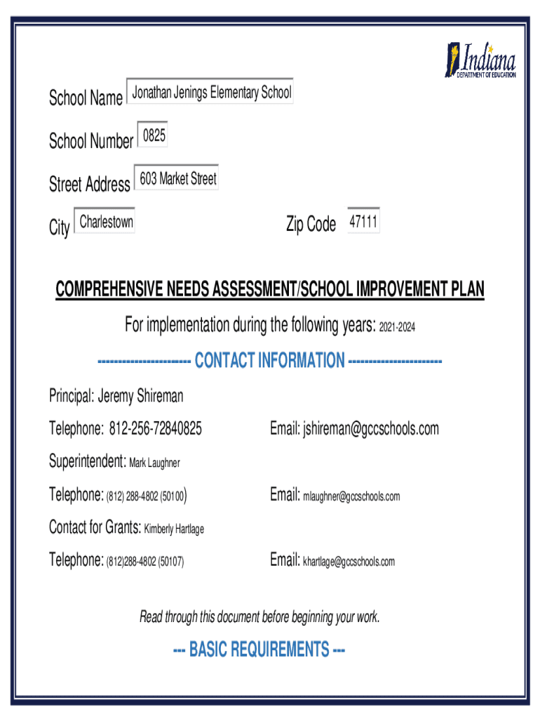School Name Jonathan Jennings Elementary School Number 0825 Street Address 603 Market Street City Charlestown Code47111COMPREHENSIVE NEEDS ASSESSMENT/SCHOOL IMPROVEMENT PLAN For implementation during