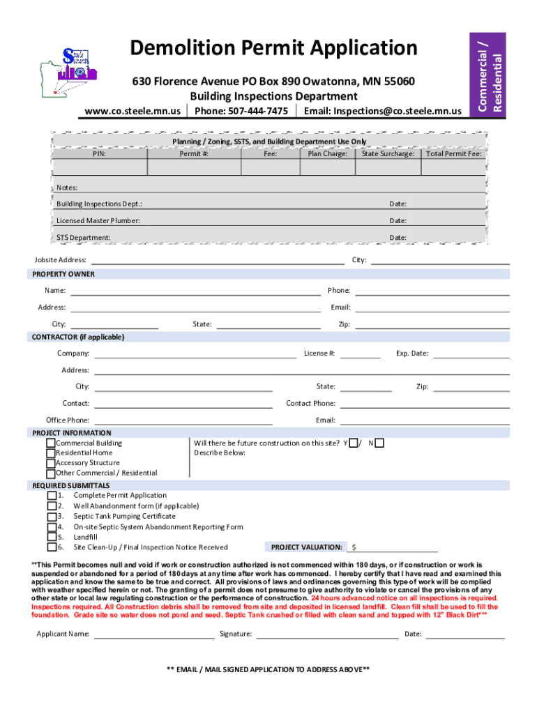 630 Florence Avenue PO Box 890 Madonna, MN 55060 Building Inspections Department.co. Steele.MN.phone: 5074447475Email: Inspections@co.steele.mn.usCommercial / ResidentialDemolition Permit ApplicationPlanning