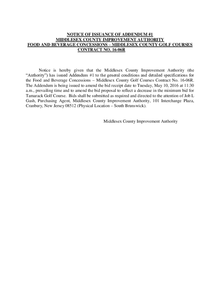 NOTICE OF ISSUANCE OF ADDENDUM #1 MIDDLESEX COUNTY IMPROVEMENT AUTHORITY FOOD AND BEVERAGE CONCESSIONS MIDDLESEX COUNTY GOLF COURSES CONTRACT NO. 1606RNotice is hereby given that the Middlesex County