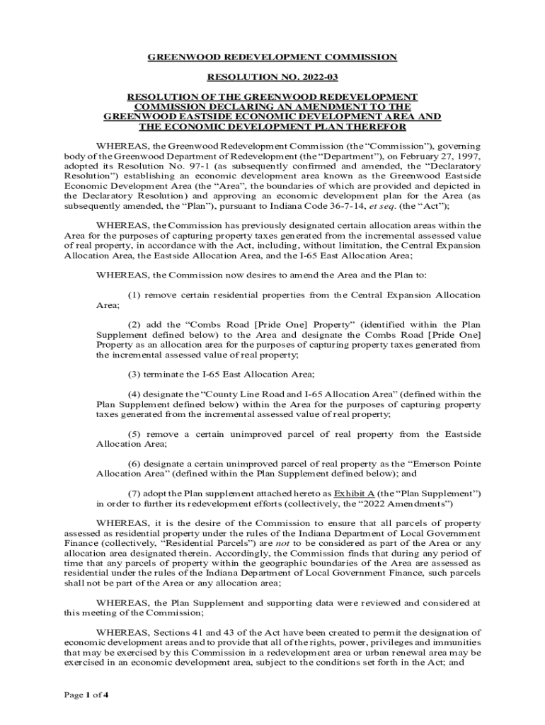 GREENWOOD REDEVELOPMENT COMMISSION RESOLUTION NO. 202203 RESOLUTION OF THE GREENWOOD REDEVELOPMENT COMMISSION DECLARING AN AMENDMENT TO THE GREENWOOD EASTSIDE ECONOMIC DEVELOPMENT AREA AND THE ECONOMIC