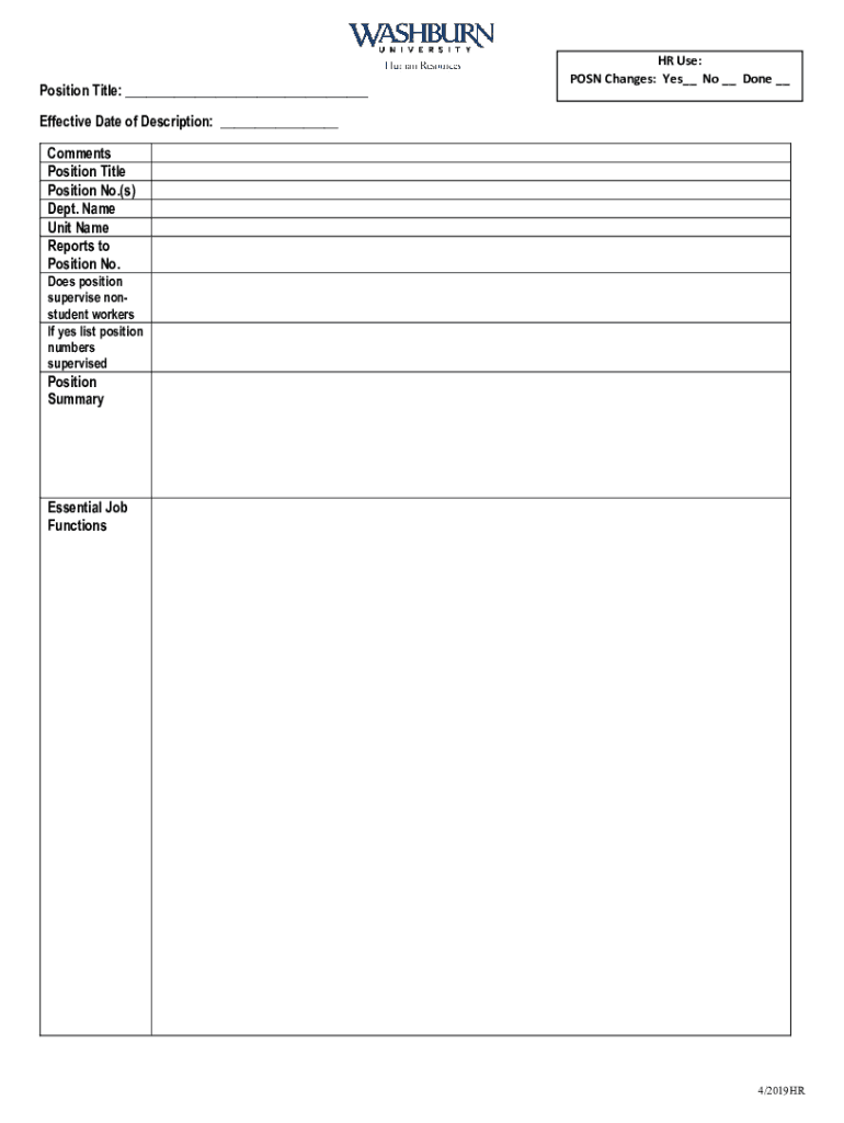 Position Title: ___HR Use: POST Changes: Yes__ No __ Done __Effective Date of Description: ___ Comments Position Title Position No.(s) Dept. Name Unit Name Reports to Position No. Does position supervise