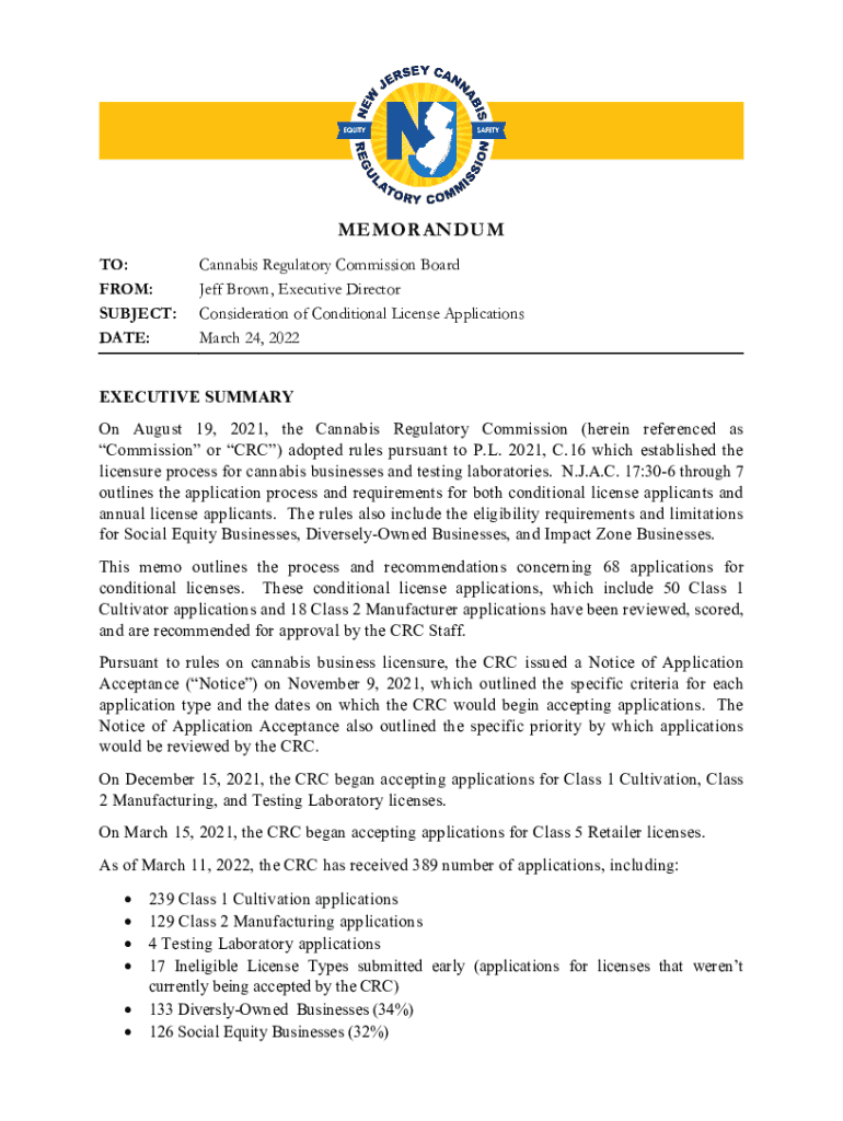 MEMORANDUM TO: FROM: SUBJECT: DATE:Cannabis Regulatory Commission Board Jeff Brown, Executive Director Consideration of Conditional License Applications March 24, 2022EXECUTIVE SUMMARY On August 19,