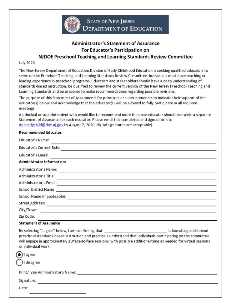 July 2020Administrators Statement of Assurance For Educators Participation on NJ DOE Preschool Teaching and Learning Standards Review Committee New Jersey Department of Education Division of Early