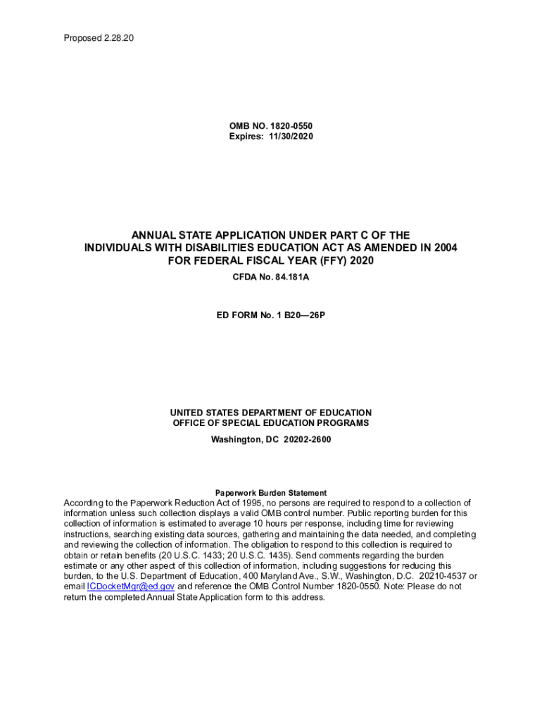 Proposed 2.28.20OMB NO. 18200550 Expires: 11/30/2020ANNUAL STATE APPLICATION UNDER PART C OF THE INDIVIDUALS WITH DISABILITIES EDUCATION ACT AS AMENDED IN 2004 FOR FEDERAL FISCAL YEAR (FLY) 2020 CODA