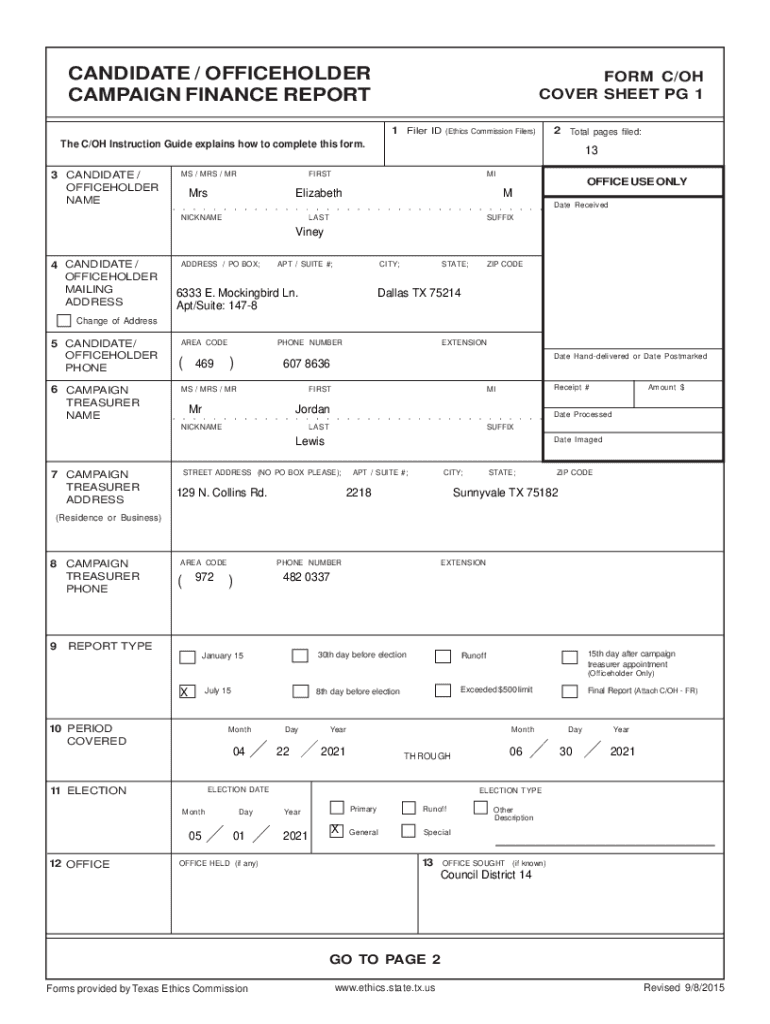 CANDIDATE / OFFICEHOLDER CAMPAIGN FINANCE REPORTER C/OH COVER SHEET PG 1 1 Filer ID2 Total pages filed:(Ethics Commission Filers)The C/OH Instruction Guide explains how to complete this form. MS /