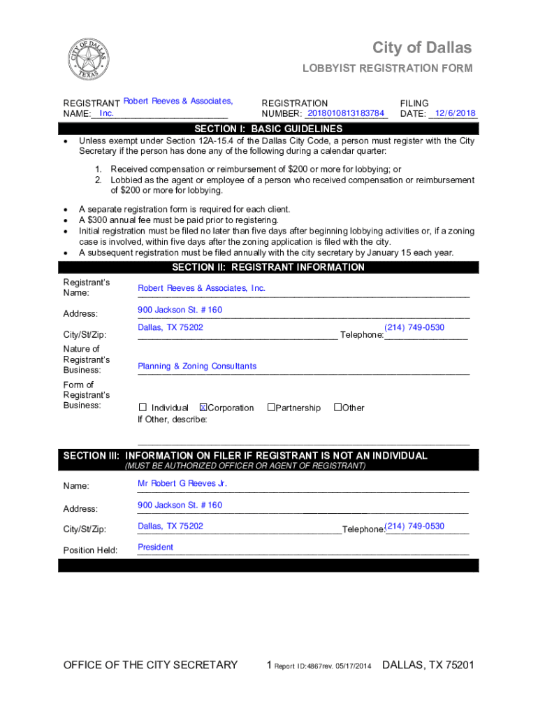 City of Dallas LOBBYIST REGISTRATION FORM REGISTRANT Robert Reeves & Associates, Inc. NAME:___REGISTRATION 2018010813183784 NUMBER: ___FILING 12/6/2018 DATE: ___SECTION I: BASIC GUIDELINES Unless