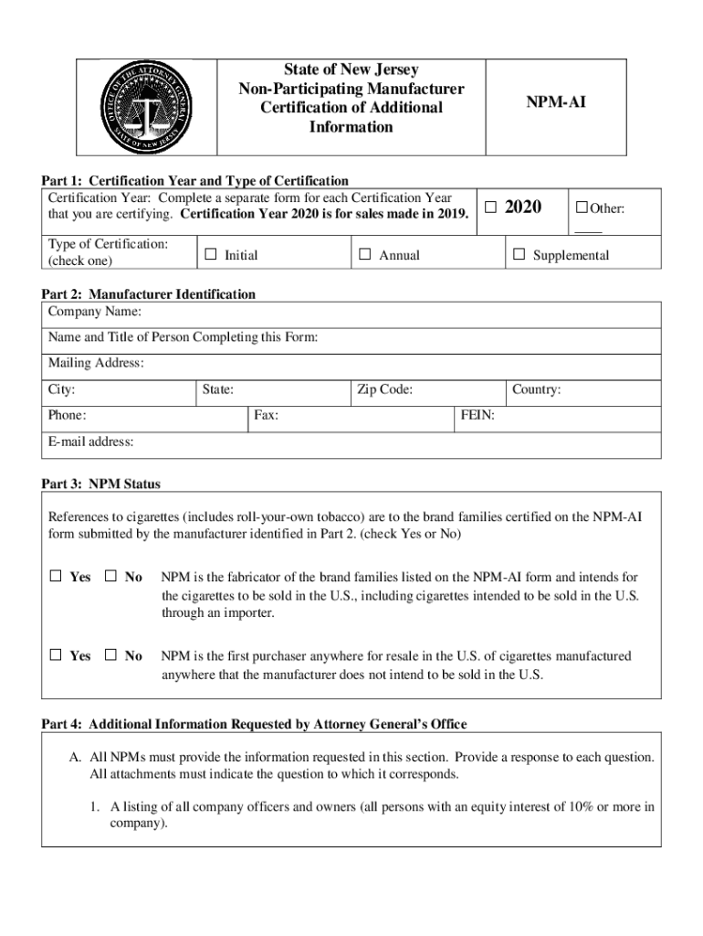 State of New Jersey Nonparticipating Manufacturer Certification of Additional Information Part 1: Certification Year and Type of Certification Year: Complete a separate form for each Certification