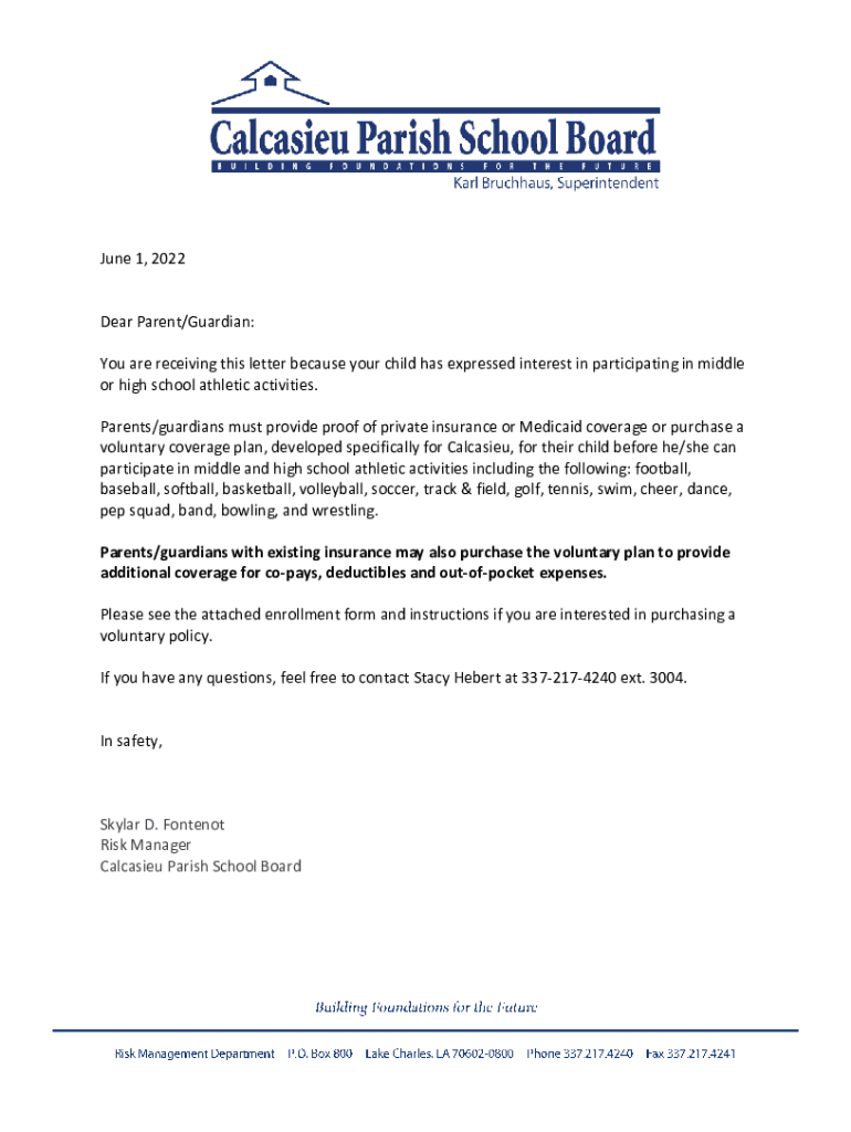 June 1, 2022Dear Parent/Guardian: You are receiving this letter because your child has expressed interest in participating in middle or high school athletic activities. Parents/guardians must provide