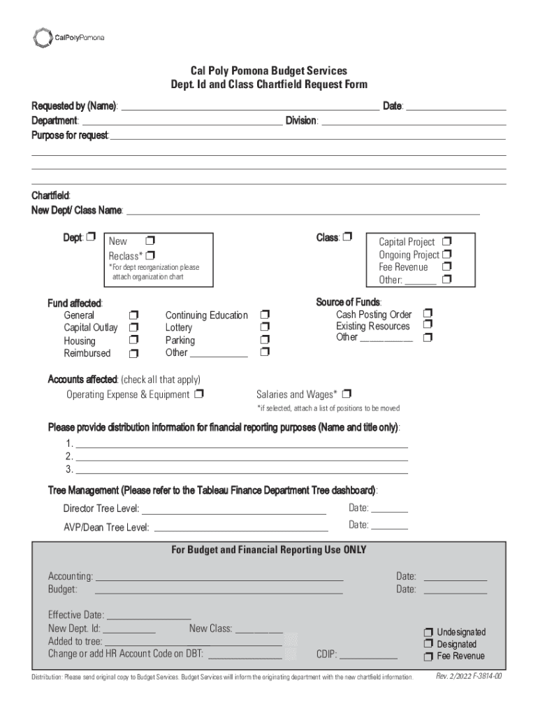 Cal Poly Pomona Budget Services Dept. I'd and Class Chart field Request Form Requested by (Name): ___ Date: ___ Department: ___ Division: ___ Purpose for request:___ ___ ___ ___ Chart field: New Dept/