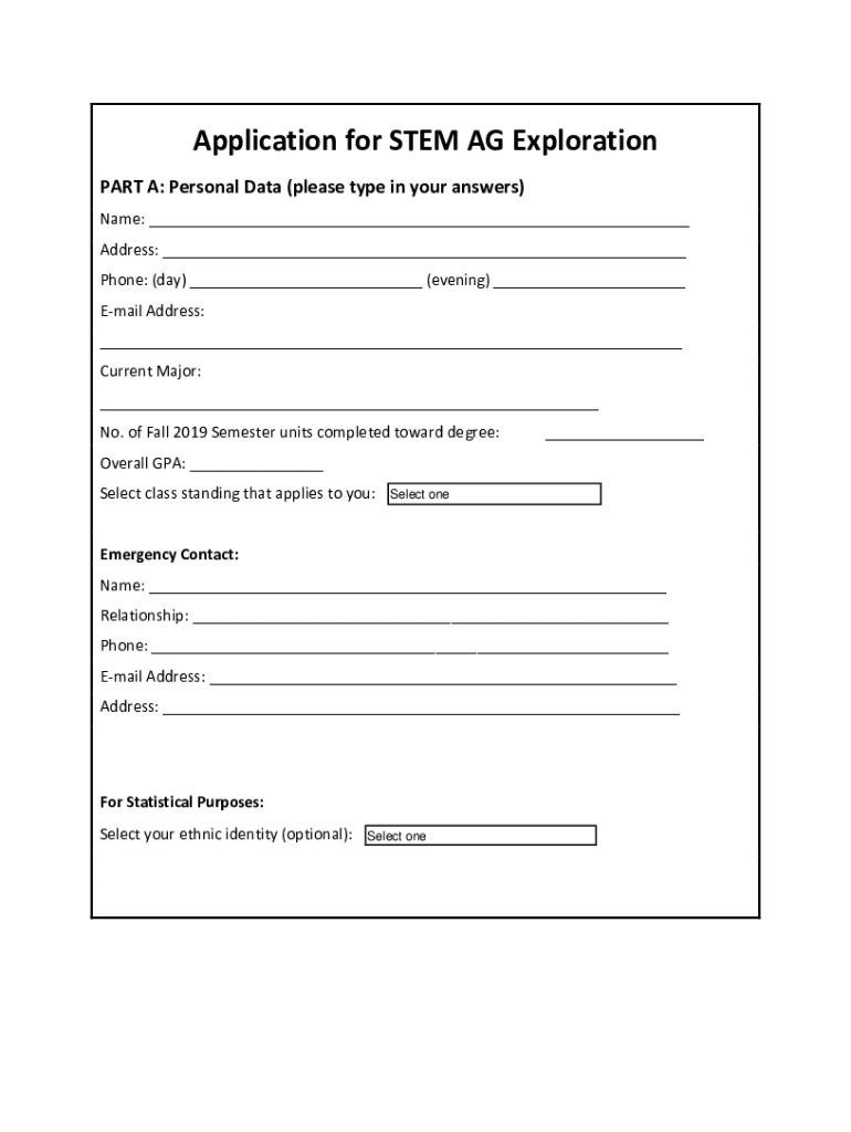Application for STEM AG Exploration PART A: Personal Data (please type in your answers) Name: ___ Address: ___ Phone: (day) ___ (evening) ___ Email Address: ___ Current Major: ___ No. of Fall 2019
