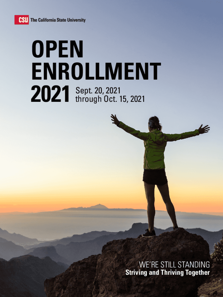 OPEN ENROLLMENT 2021 Sept. 20, 2021 through Oct. 15, 2021WERE STILL STANDINGStriving and Thriving TogetherWELCOME TO THE CSU OPEN ENROLLMENT FOR 2022WERE STILL STANDINGStriving and Thriving Togetherness