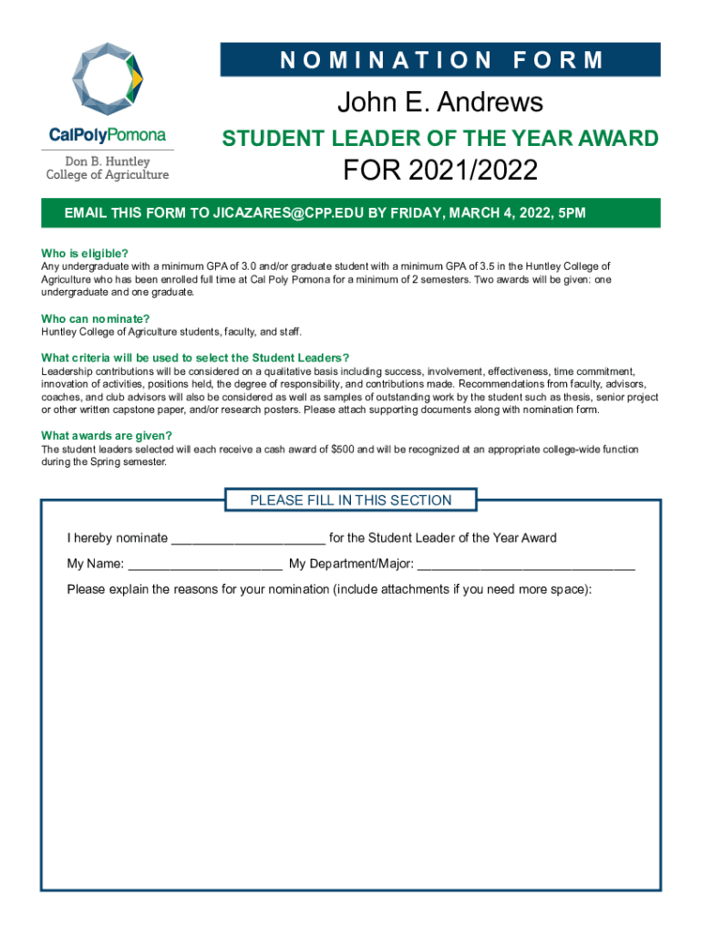 N O M I N AT I O N F O RM John E. Andrews STUDENT LEADER OF THE YEAR AWARD 2021/2022EMAIL THIS FORM TO JICAZARES@CPP.EDU BY FRIDAY, MARCH 4, 2022, 5PM Who is eligible? Any undergraduate with a minimum