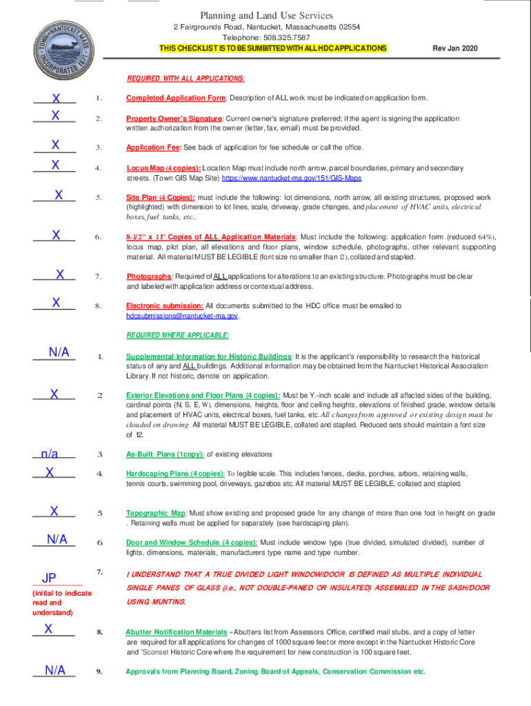 Planning and Land Use Services 2 Fairgrounds Road, Nantucket, Massachusetts 02554 Telephone: 508.325.7587THIS CHECKLIST IS TO BE SUBMITTED WITH ALL HD APPLICATIONS Rev Jan 2020REQUIRED WITH ALL APPLICATIONS:X