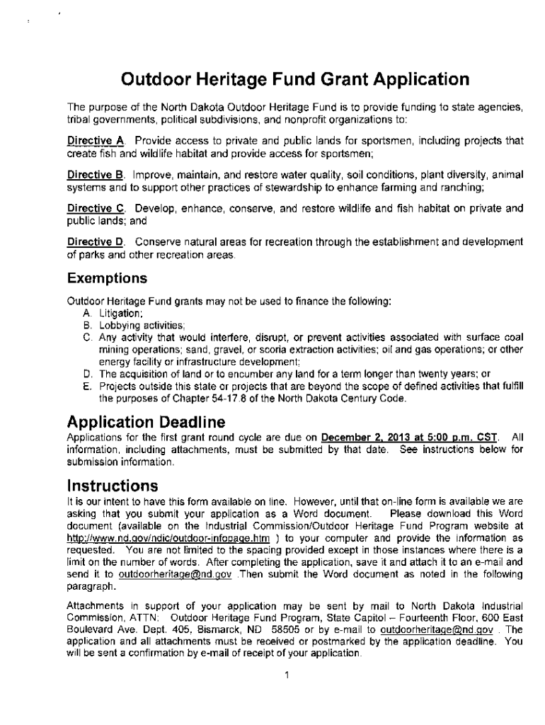Outdoor Heritage Fund Grant Application The purpose of the North Dakota Outdoor Heritage Fund is to provide funding to state agencies, tribal governments, political subdivisions, and nonprofit organizations