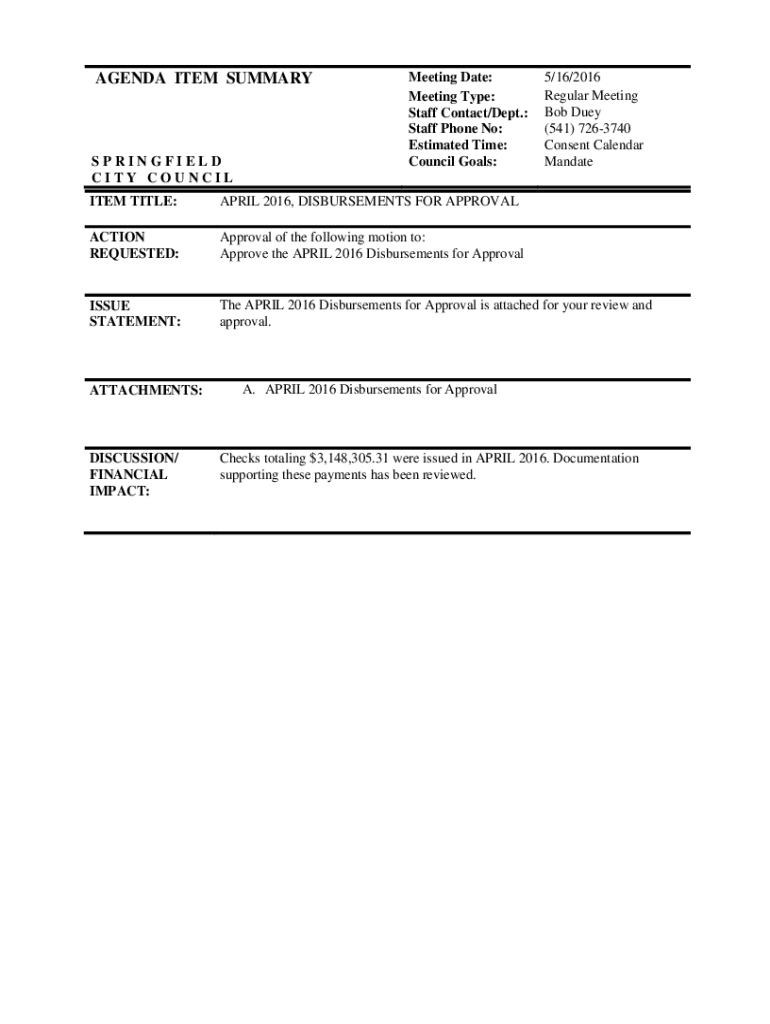 AGENDA ITEM SUMMARYSPRINGFIELD CITY COUNCILMeeting Date: Meeting Type: Staff Contact/Dept.: Staff Phone No: Estimated Time: Council Goals:5/16/2016 Regular Meeting Bob Due (541) 7263740 Consent Calendar