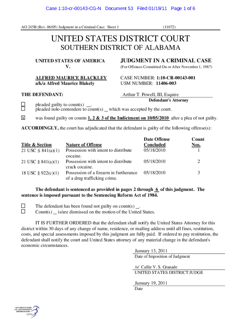 Case 1:10cr00143CGN Document 53 Filed 01/19/11-Page 1 of 6AO 245B (Rev. 06/05) Judgment in a Criminal Case: Sheet 1(11072)UNITED STATES DISTRICT COURT SOUTHERN DISTRICT OF ALABAMA UNITED STATES OF