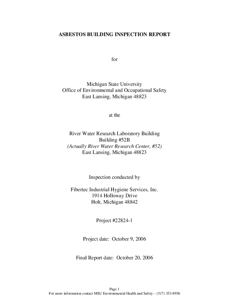 ASBESTOS BUILDING INSPECTION REPORTforMichigan State University Office of Environmental and Occupational Safety East Lansing, Michigan 48823at thrive Water Research Laboratory Building #52B (Actually
