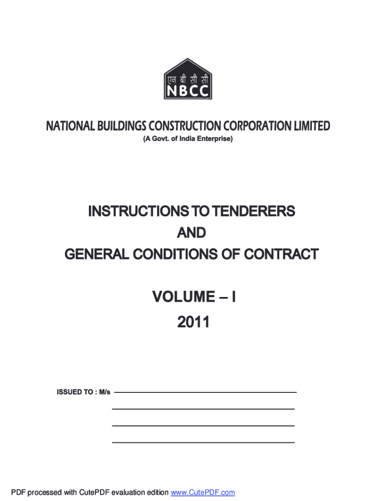 PDF processed with Cute PDF evaluation edition www.CutePDF.comINDEX National Buildings Construction Corporation LimitedINDEX VOLUME IS. No.DESCRIPTIONCLAUSE NO.PAGE NO.1INSTRUCTIONS TO TENDERERS12FORMAT