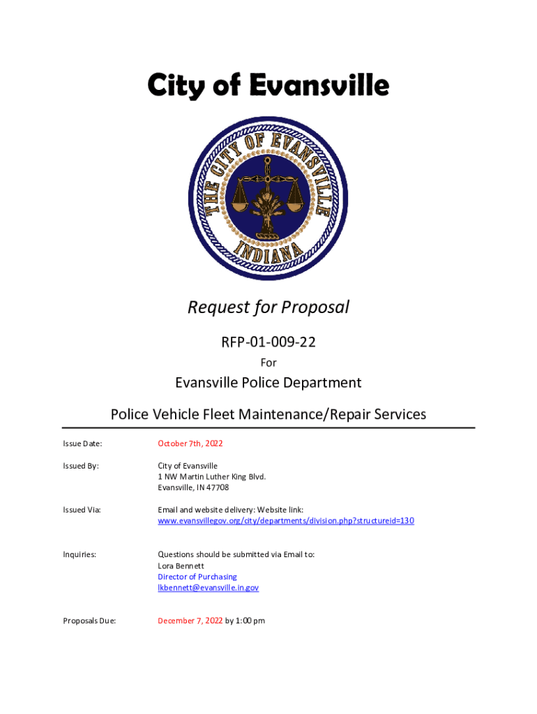 City of EvansvilleRequest for Proposal RFP0100922 For Evansville Police Department Police Vehicle Fleet Maintenance/Repair Services Issue Date:October 7th, 2022Issued By:City of Evansville 1 NW Martin