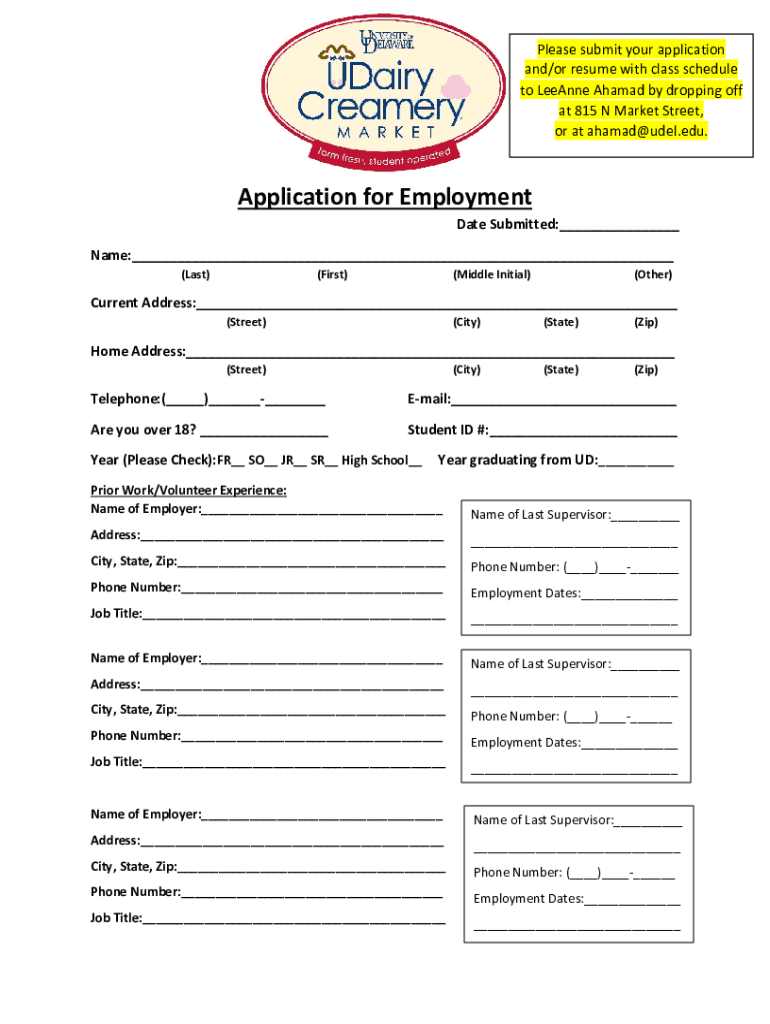 Please submit your application and/or resume with class schedule to Leanne Ahmad by dropping off at 815 N Market Street, or at ahamad@udel.edu. Application for EmploymentDate Submitted:___Name:___