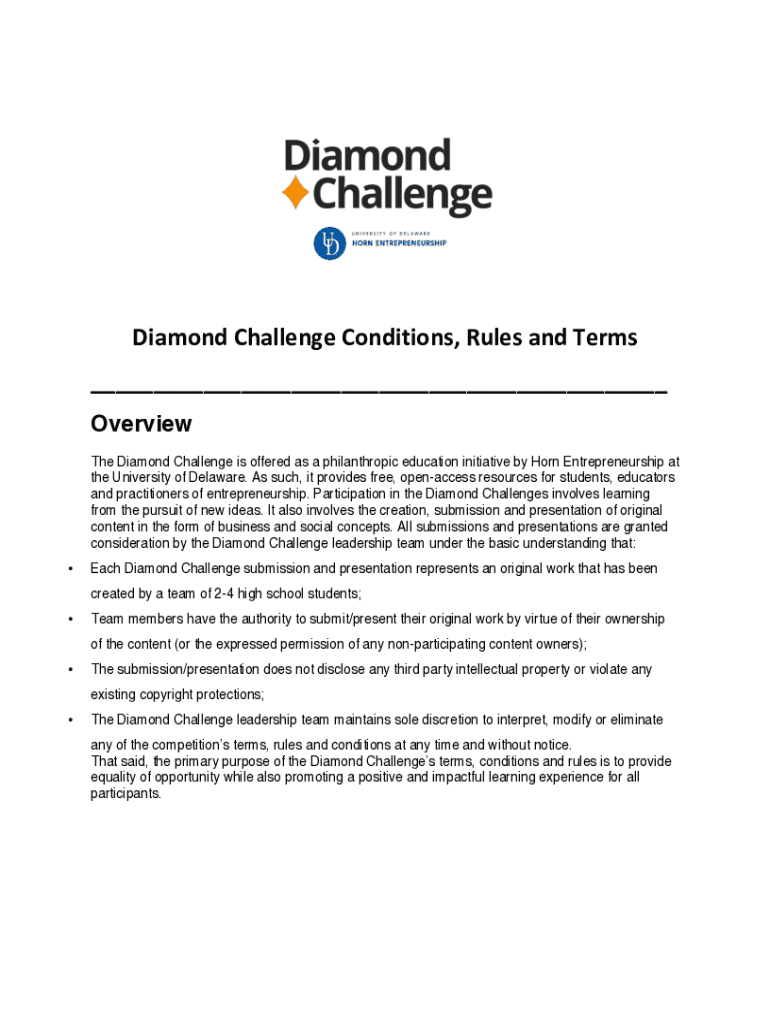 DiamondChallengeConditions, RulesandTerms ___ Overview The Diamond Challenge is offered as a philanthropic education initiative by Horn Entrepreneurship at the University of Delaware. As such, it